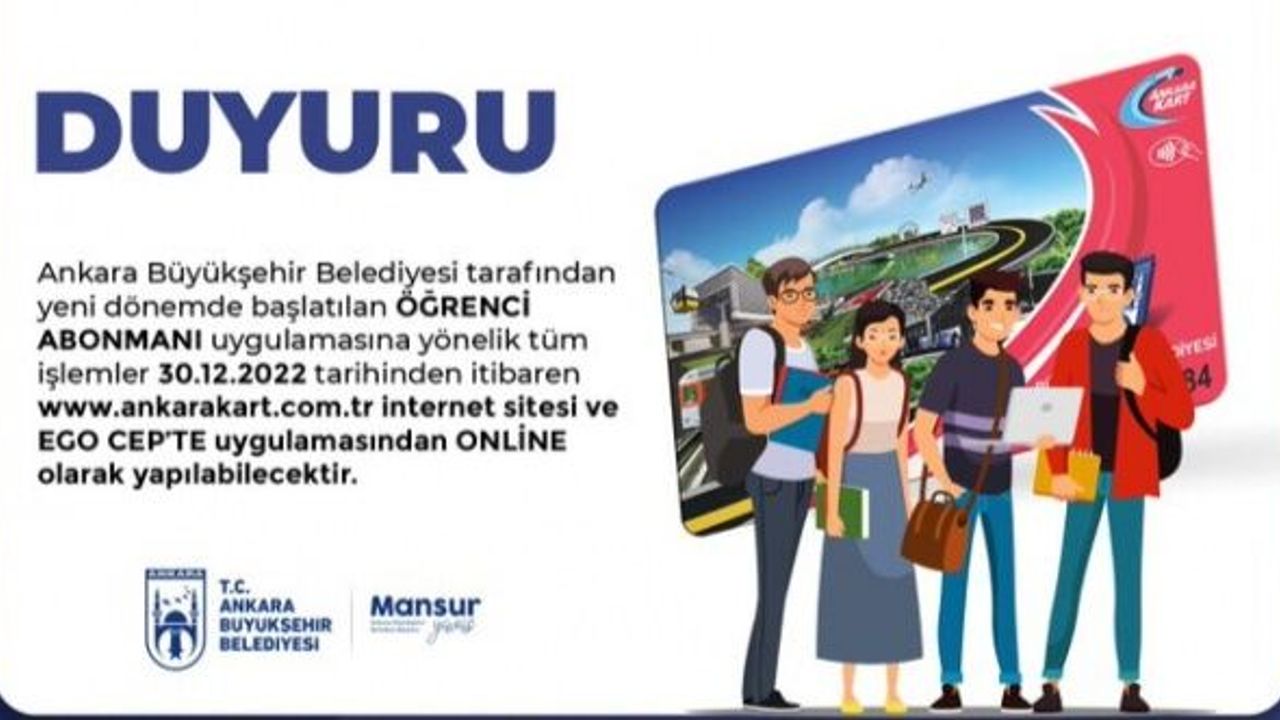 Duyuruya göre 30.12.2022 tarihinden itibaren abonman işlemleri www.ankarakart.com.tr adresinden ya da EGO CEP'te uygulamasından online olarak yapılabilecek.
