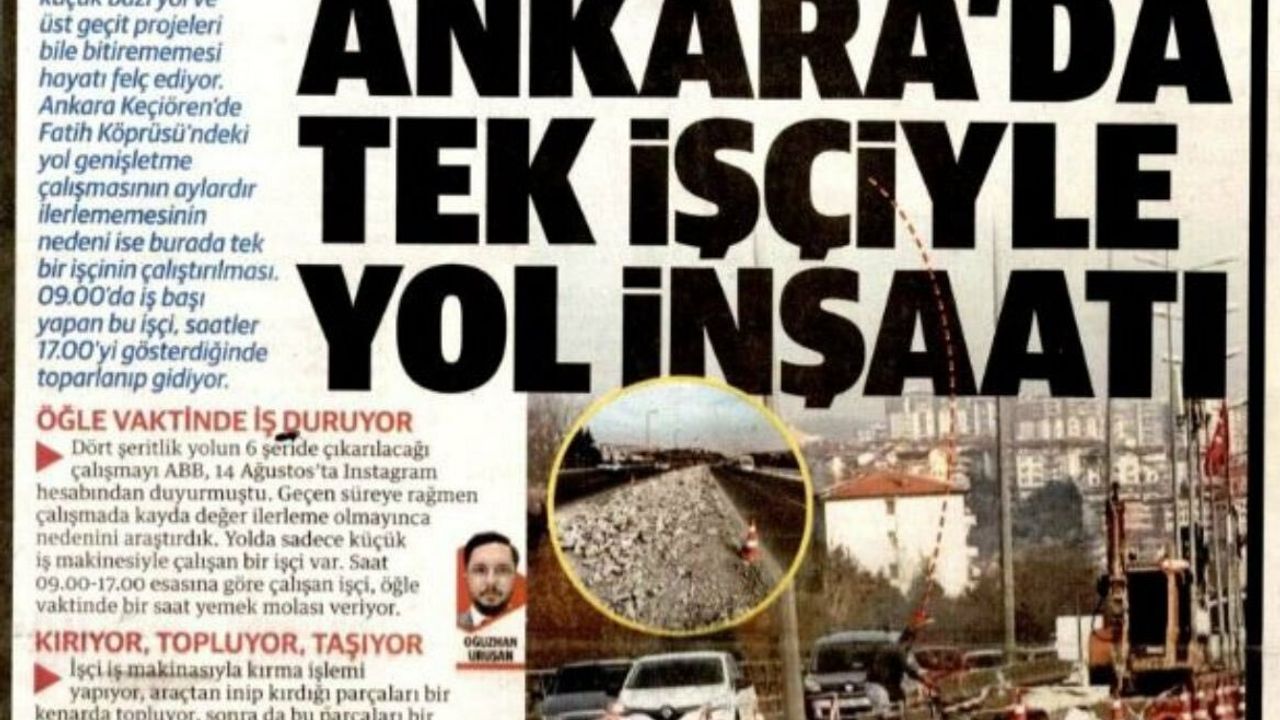 Ankara Büyükşehir Belediyesi, Yeni Şafak Gazetesi'nin, "Ankara'da tek işçiyle yol inşaatı" haberini yalanladı. Belediyeden yapılan açıklamada, şu ifadelere yer verildi: