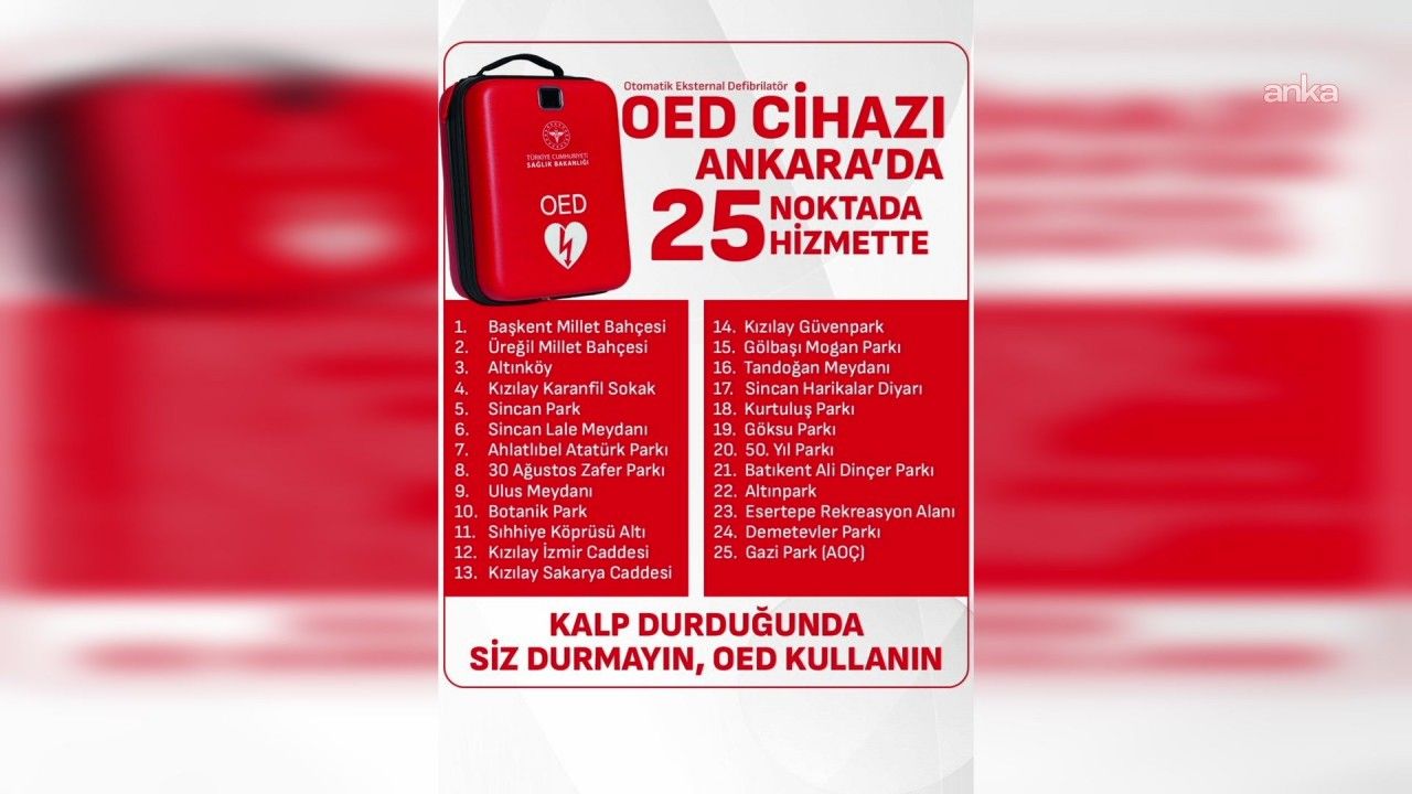 Ankara Valiliği, Sağlık Bakanlığı ve ASELSAN iş birliğiyle geliştirilen yerli Otomatik Şok Cihazı (OED) Projesi kapsamında cihazların kentte belirlenen 25 noktaya yerleştirilerek halkın hizmetine sunulmasına ilişkin sosyal medya hesabından paylaşım yaptı.
