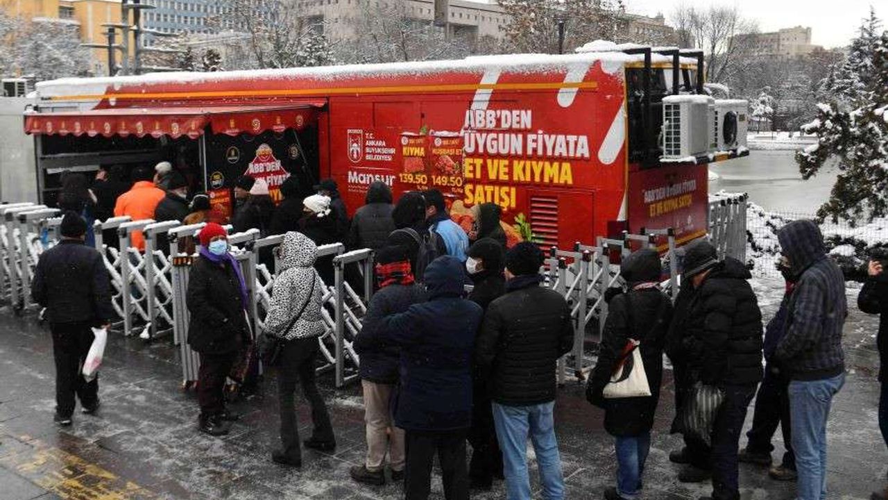 Ankara Büyükşehir Belediyesi’nin başlattığı ucuz et projesi kapsamında hayata geçirilen Abdi İpekçi Parkı'nda kurulan Başkent Mobil Market aracı önünde, sabahın erken saatlerinde, soğuk havaya rağmen kuyruk oluştu.