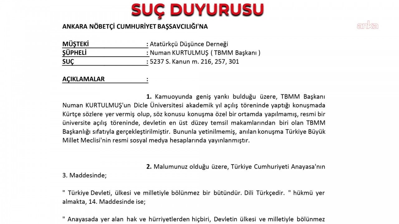 ADD'nin Kurtulmuş hakkında "halkı kin ve düşmanlığa tahrik", "görevi kötüye kullanma", "Türk milletini, Türkiye Cumhuriyeti Devletini, devletin kurum ve organlarını aşağılama" ve "Anayasayı ihlal" suçlarından hazırladığı suç duyurusu dilekçesi, Ankara Cumhuriyet Başsavcılığı'na verildi.