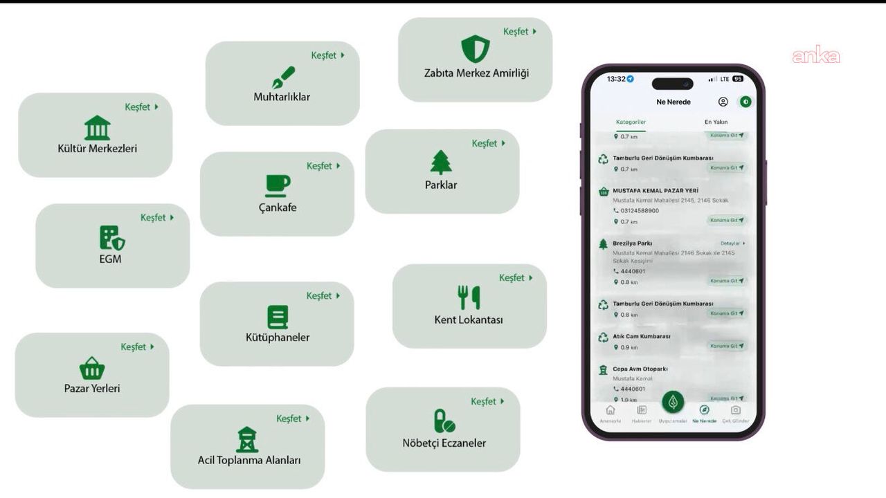 Çankapp’in “Ne Nerede” özelliği, Çankaya’daki belediye hizmet alanlarını harita üzerinden görüntüleme imkanı sunuyor. Kent lokantaları, Çankafeler, parklar, kütüphaneler, kültür merkezleri, pazar yerleri, muhtarlıklar, polis ve zabıta merkezleri, nöbetçi eczaneler ile acil toplanma alanları gibi birçok noktaya uygulama üzerinden ulaşılabiliyor. Kullanıcılar tek tıkla yol tarifi alabiliyor, kategorilere göre keşif yapabiliyor ya da en yakın hizmet noktasını görüntüleyebiliyor.