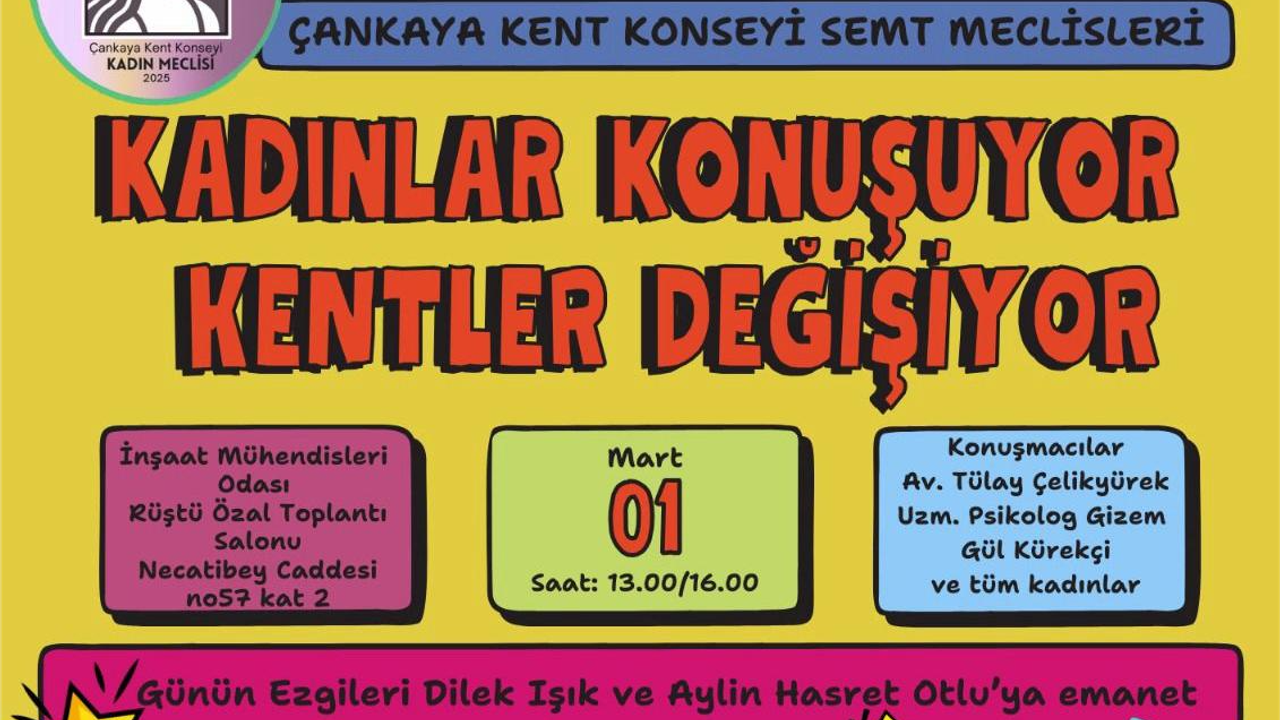 Çankaya Kent Konseyi Kadın Meclisi ve Semt Meclisleri’nin 1 Mart Pazar günü İnşaat Mühendisleri Odası Rüştü Özal Toplantı Salonu’nda düzenleyeceği "Kadınlar Konuşuyor, Kentler Değişiyor" panelinde kadınların kent yaşamındaki hakları ve psikososyal süreçleri ele alınacak. Panelde, Avukat Tülay Çelikyürek ve Uzman Psikolog Gizem Gül Kürekçi konuşacak.
