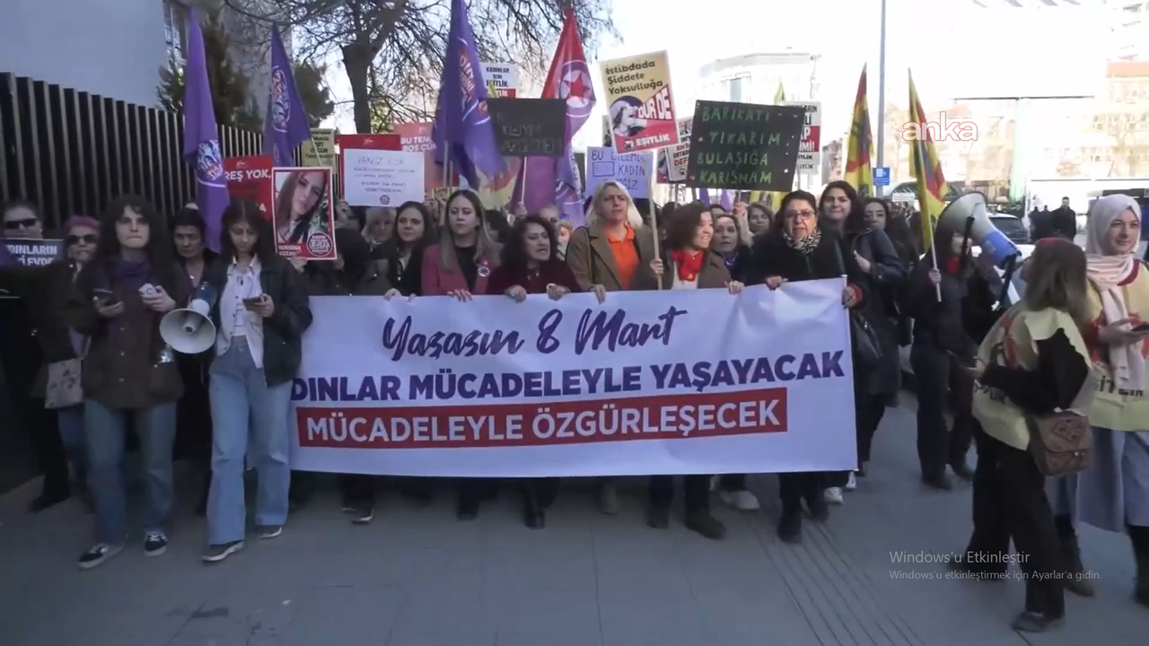"8 Mart eşitlik, özgürlük ve onurlu bir yaşam uğruna toprağa düşenlerin, fabrikalarda direnenlerin ve sokakları terk etmeyen milyonlarca kadının ortak hafızası ve sönmeyen isyanıdır. Bizler bugün Ankara’da kadın örgütleriyle, siyasi partilerle ve bu kentin meydanlarını hak aramaktan vazgeçmeyerek dolduran tüm kadınlarla birlikte, omuz omuza verdiğimiz yürüyüşün sonunda, haklarımızı haykırmak için buradayız.