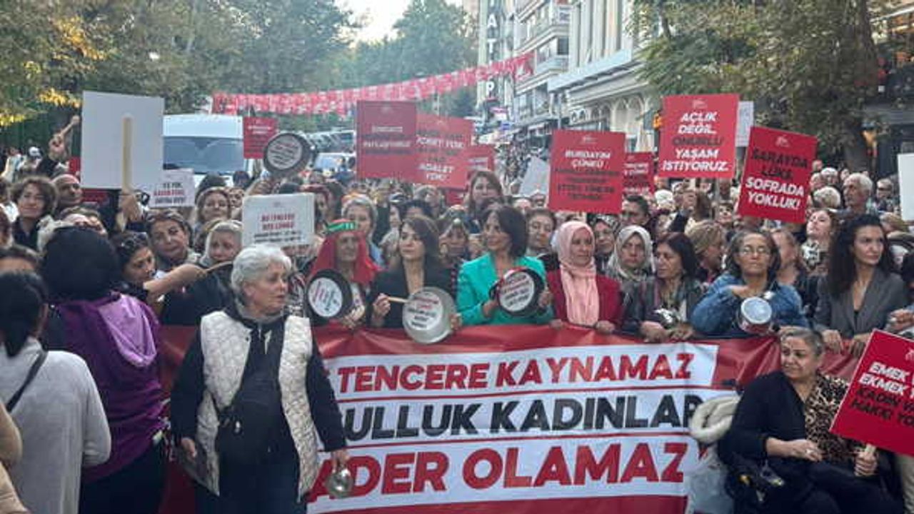 “Bu tencere boş çünkü sarayın sofraları taşıyor”, “Buradayım çünkü kaynamayan tencerede AKP’nin tuzu var” ve “Aile yılı müjdesi boş tencere” yazılı pankartlar taşıyan kadınlar, boş tencerelere vurarak düdük çaldı.