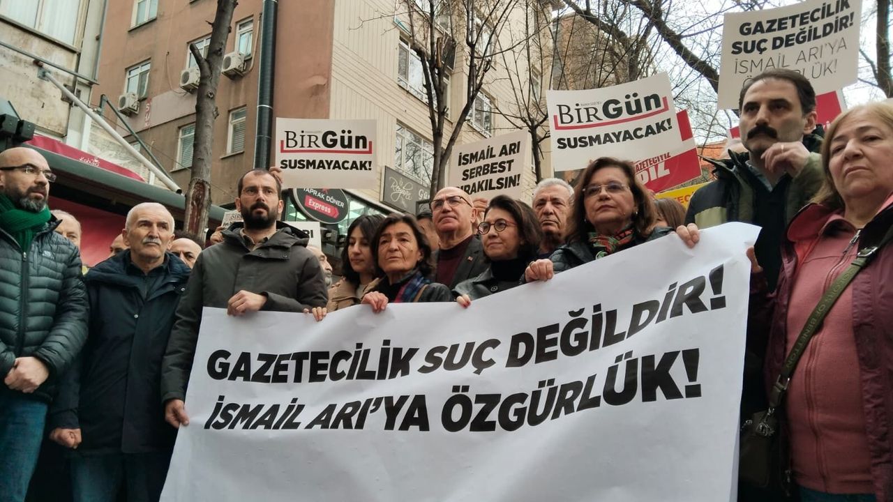 "BirGün susmayacak", "İsmail Arı serbest bırakılsın", "Gazetecilik suç değildir, İsmail Arı'ya özgürlük", "Biz gazeteciyiz" gibi dövizlerin taşındığı eylemde, "Özgür basın susturulamaz", "İsmail Arı yalnız değildir" sloganları atıldı.