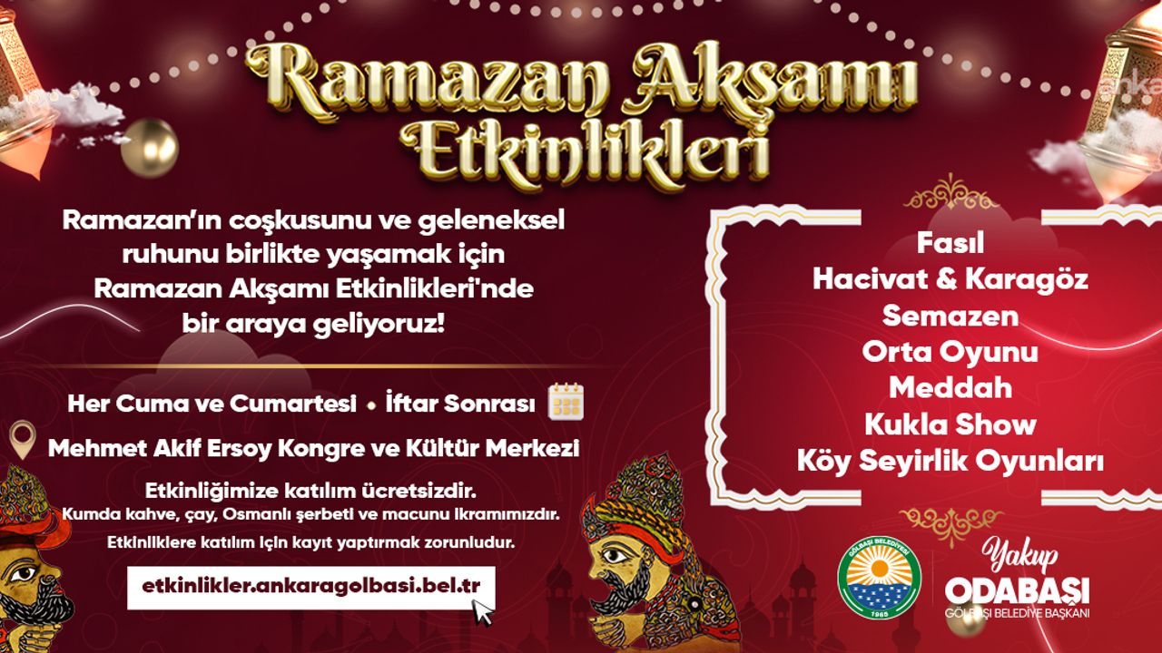 Gölbaşı Belediyesi, ramazan ayının manevi atmosferini ilçe genelinde yaşatmak amacıyla kapsamlı bir etkinlik ve iftar programı hazırladı. Bu kapsamda her cuma ve cumartesi günü saat 21.15’te, Mehmet Akif Ersoy Kongre ve Kültür Merkezi’nde düzenlenecek Ramazan Akşamı Etkinlikleri, her yaştan vatandaşa hitap edecek içeriklerle gerçekleştirilecek. Program kapsamında fasıl, Hacivat ve Karagöz, semazen gösterisi, orta oyunu, meddah, kukla gösterisi ve köy seyirlik oyunları yer alacak. Etkinliklerde ayrıca vatandaşlara kumda kahve, çay, Osmanlı şerbeti ve Osmanlı macunu ikram edilecek.