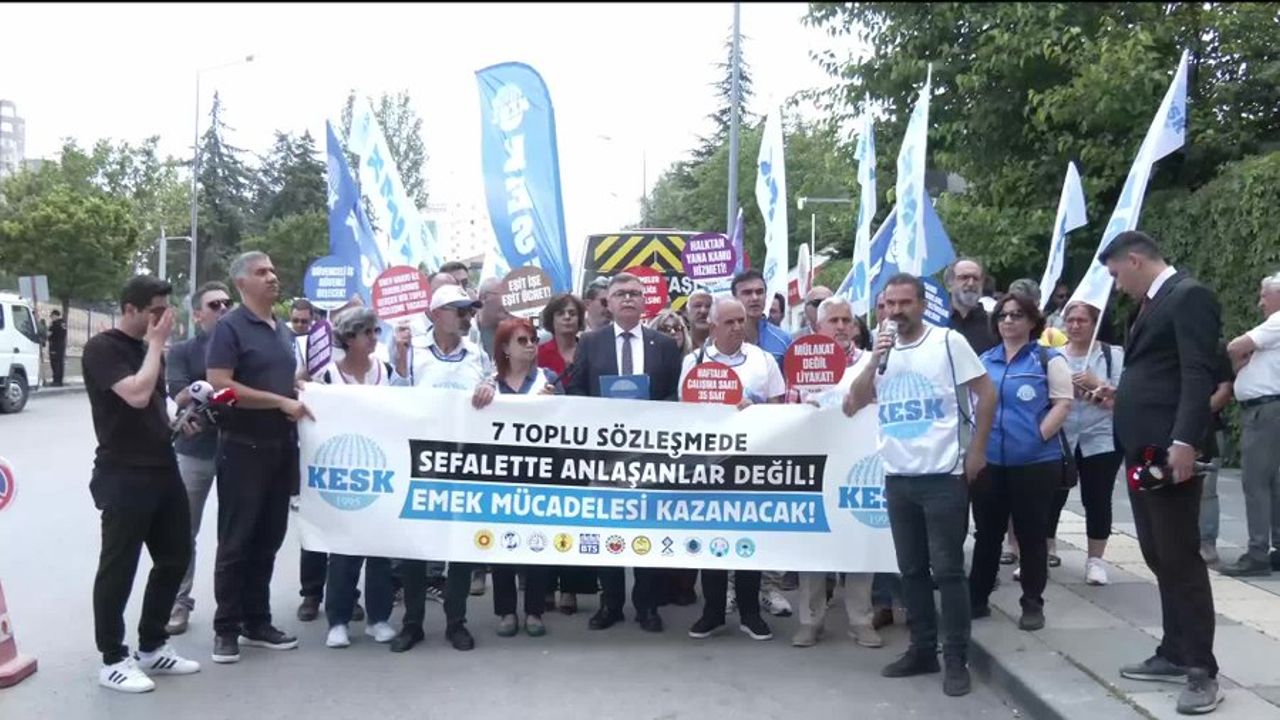 Kamu Emekçileri Sendikası Konfederasyonu (KESK), Çalışma ve Sosyal Güvenlik Bakanlığı önünde 1 Ağustos’ta başlayacak 2026-2027 yıllarını kapsayan 8. Dönem Toplu Sözleşme (TİS) sürecine ilişkin basın açıklaması yaptı. KESK adına basın açıklaması, KESK Eş Genel Başkanı Ahmet Karagöz tarafından okundu.