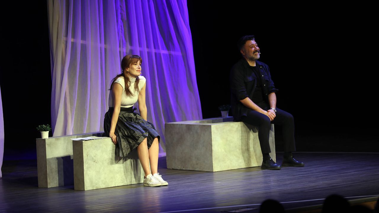 İki oyuncunun sahnelediği oyunda, boşanma aşamasında olan çiftin bir cenaze töreninde yaşadığı olaylar mizahi bir dille ele alındı. Kahkahanın biran olsun dinmediği salonda, keyifli anlar yaşayan vatandaşlar oyuncuları ayakta alkışladı.